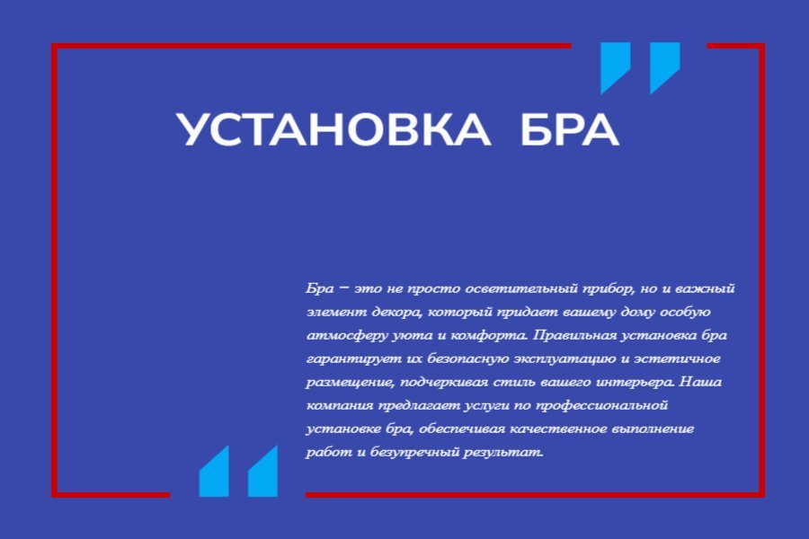 - Гарантия на выполненные работы. Мы уверены в качестве наших услуг и предоставляем гарантию на все выполненные работы. В случае возникновения каких-либо проблем с установленными бра в течение гарантийного срока, мы оперативно устраним их без дополнительных затрат для вас.