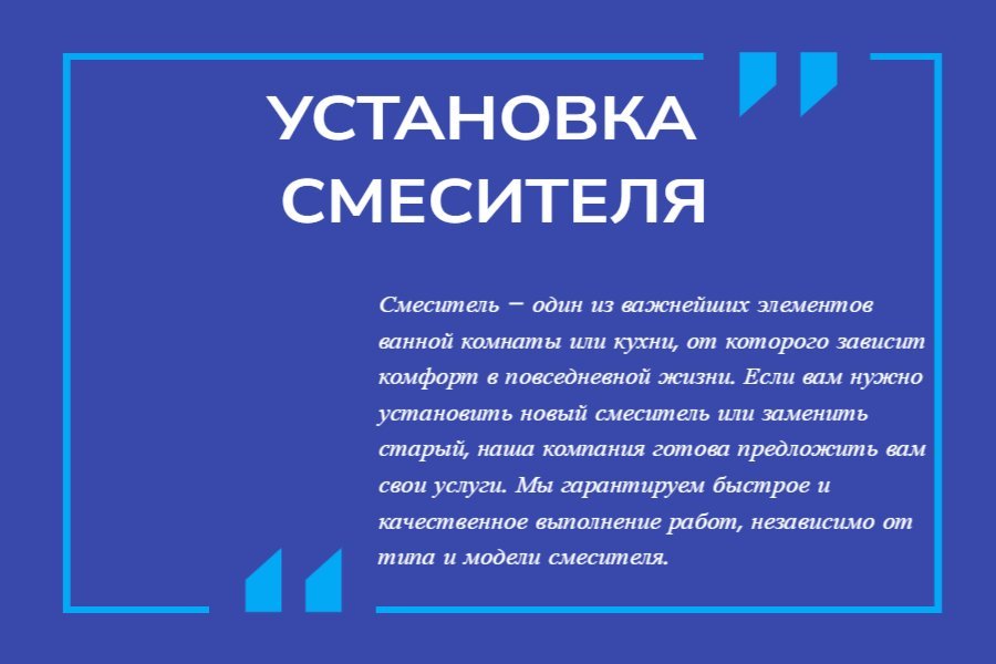 - Гарантия качества. Мы используем только проверенные материалы и инструменты, что гарантирует долгий срок службы установленного смесителя. Все работы выполняются в строгом соответствии с техническими стандартами и нормами безопасности.