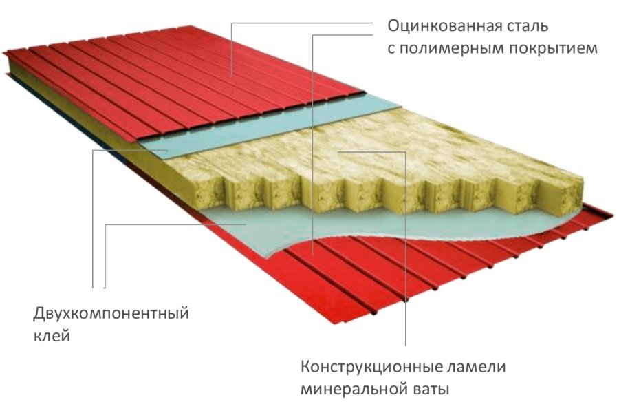Сэндвич-панели из минваты пользуются большим спросом на рынке кровельных систем. Изготовление продукции осуществляется в заводских условиях и на специальном оборудовании. Сэндвич-панель – многослойная конструкция, состоящая из двух листов и слоя теплоизоляции. Технология этой структуры позволяет стройматериалу быть легким и обеспечивает упрощение технологических работ.